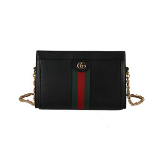 2019 프리폴 컬렉션에서 선보이는 새로운 컬러의 체인 스트랩 오피디아 숄더백. 화이트 가죽 텍스처에 블루/레드 웹(Web) 스트라이프 인레이. 마그네틱 잠금장치와 아카이브에서 차용한 더블 G 하드웨어로 마감.